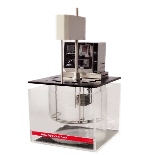 The water separability apparatus is suitable to measure the water separability of Petroleum Oils and Synthetic Fluids.Fill certain amount of sample and distilled water,stir 5 minutes under certain temperature,record needed time for separation of emulsified liquid.After half hour or one hour,if the emulsified liquid doesn’t separate completely,or the emulsified layers doesn’t reduce 3mL or more,please record the volume of oil layer,water layer and emulsified layer at this moment.